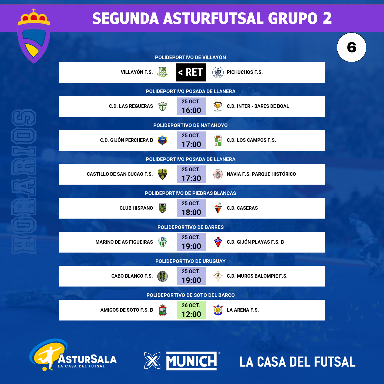 La jornada se iniciará con el partido entre el C.D. Las Regueras y el C.D. Inter Bares de Boal, y concluirá con el enfrentamiento entre Cabo Blanco F.S. y C.D. Muros Balompié, en un cierre que puede marcar diferencias importantes en la parte baja de la tabla. Con varios equipos separados por apenas un punto y enfrentamientos directos entre aspirantes al liderato, esta sexta jornada puede marcar un antes y un después en el campeonato.