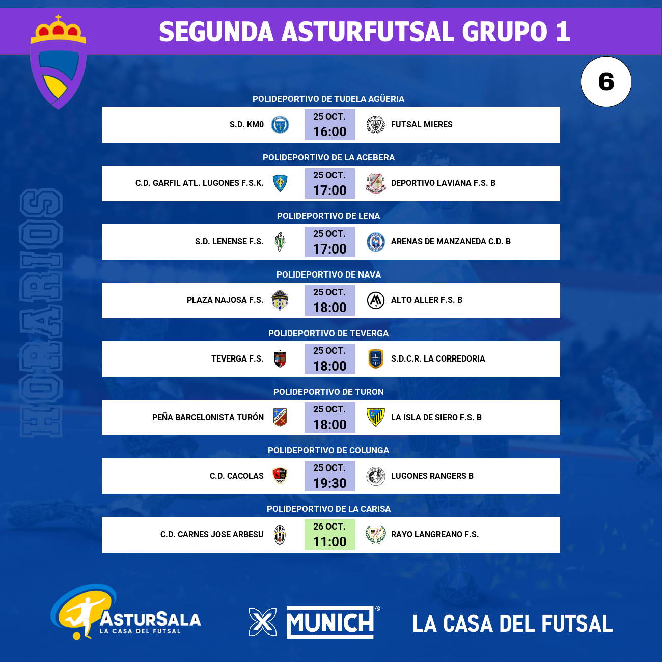 La sexta jornada del Grupo 1 de Segunda Asturfutsal se presenta como una de las más intensas y determinantes del curso. Con cinco victorias en cinco partidos, el Teverga se ha consolidado como líder indiscutible y este fin de semana buscará prolongar su racha perfecta ante La Corredoria, cuarto clasificado con diez puntos y un partido menos, tras haber cumplido ya su jornada de descanso. El duelo entre ambos promete ser uno de los más vibrantes de la fecha, enfrentando al equipo más sólido del campeonato contra uno de los aspirantes a la zona noble.